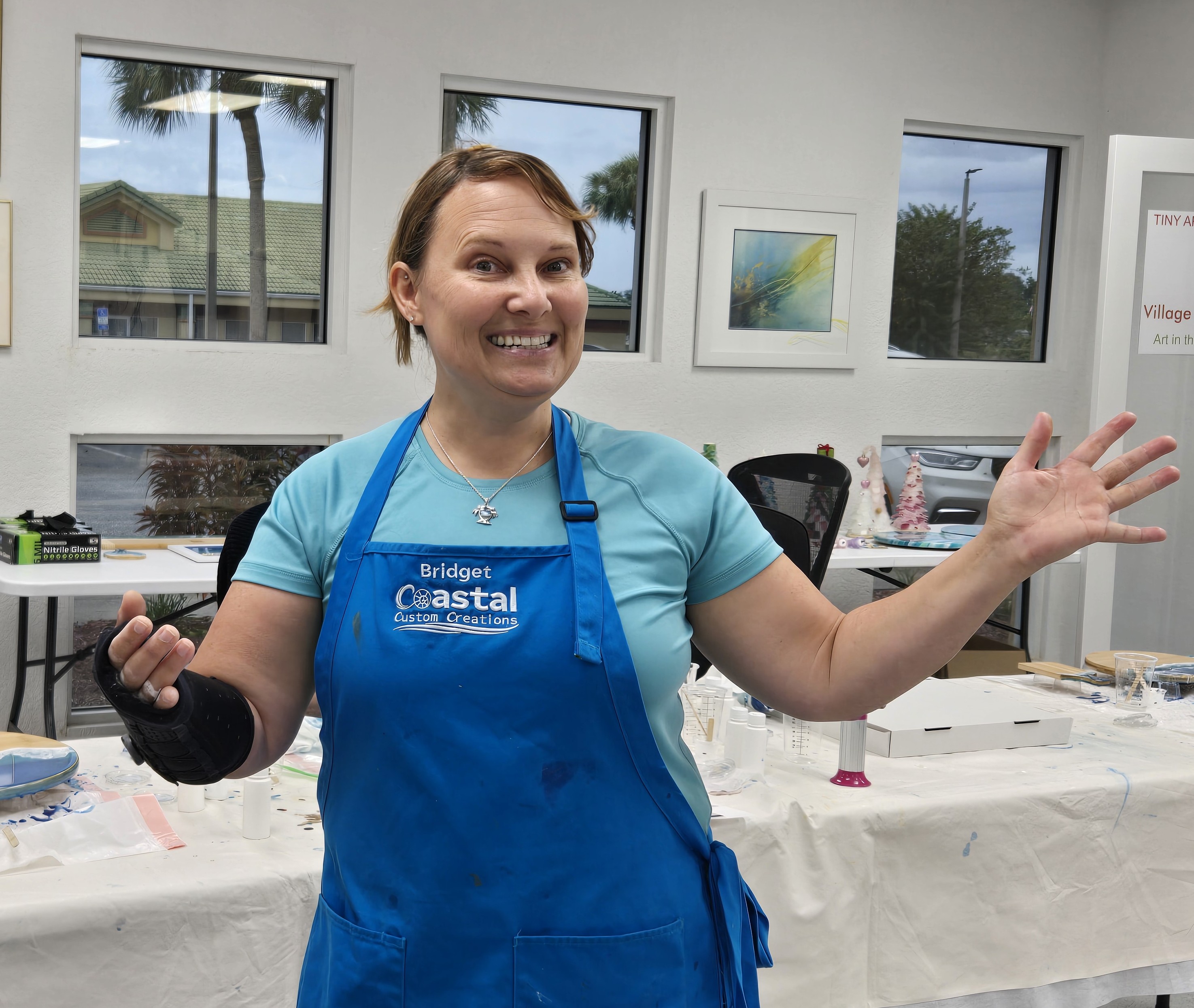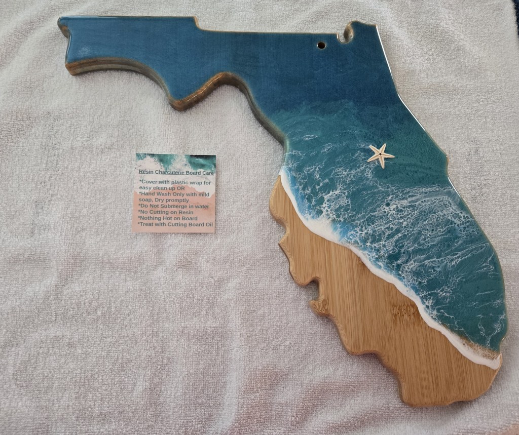 We had sort of preselected our colors, I didn’t know that I had done that, but it worked out fine. I’d have selected something RED and that probably would have been a mistake with Florida and waves and stuff. Red Tide? Probably not a good plan. We mixed our resins and played with the small boards and oohed and ahhed accordingly. It actually wasn’t that hard. Bridget showed us the painting technique for the resin which was pretty similar to paint; except if you jiggle the boards the resin will move. I had a hard time making THIN lines though. After our lines we drawn, we tapped and blended and used a blow dryer to make the resin move. (which kind of made it look like foamy waves!) When our boards were acceptable to us, we used a flame thing, similar to what you would melt marshmallows with (haha) for three seconds really FAST so as to not set the project on fire. I managed to accomplish this goal without any fires. I figured that would be my downfall, but I had close supervision with Ginger and Tracy!