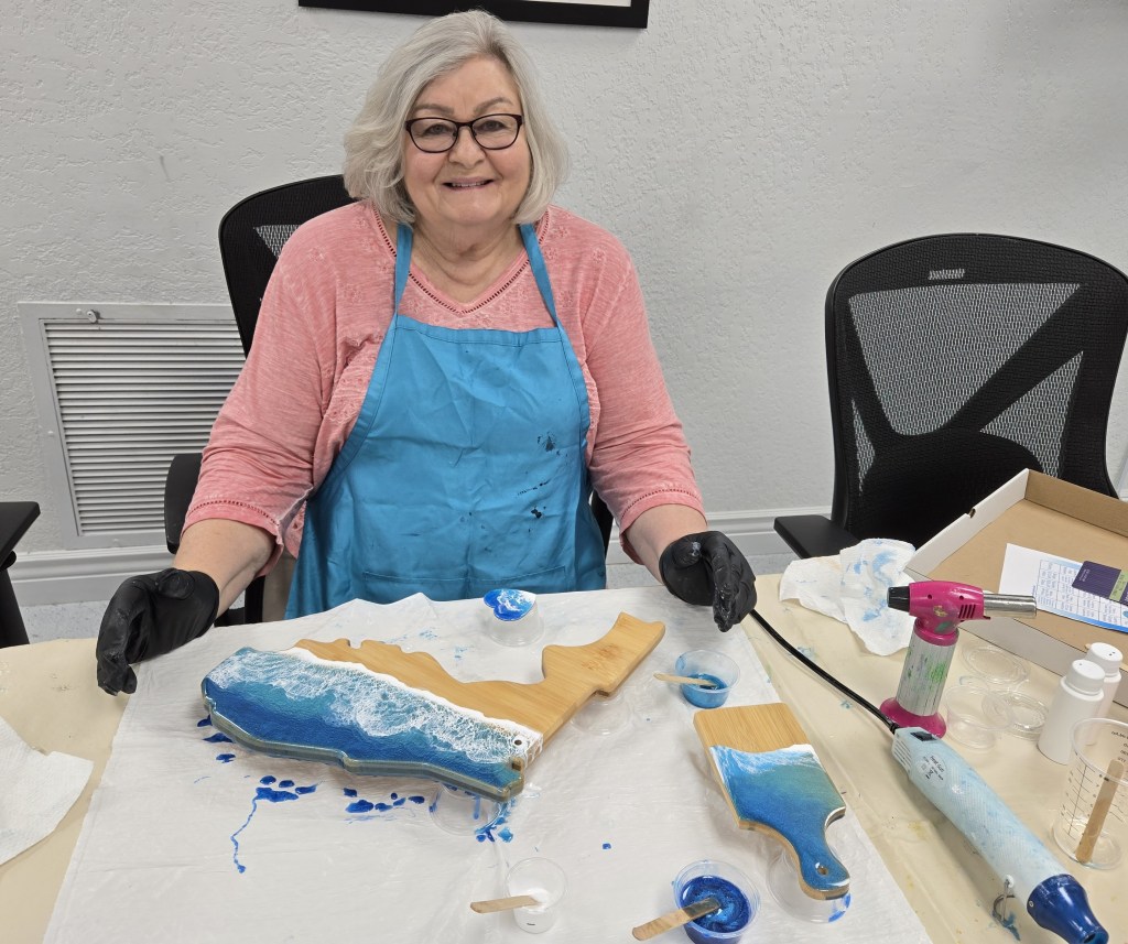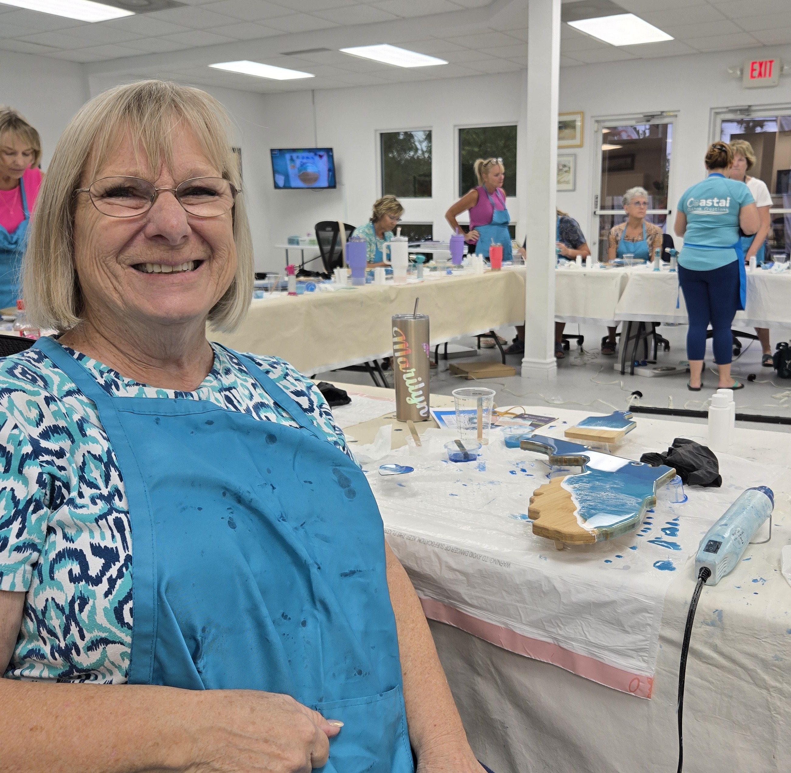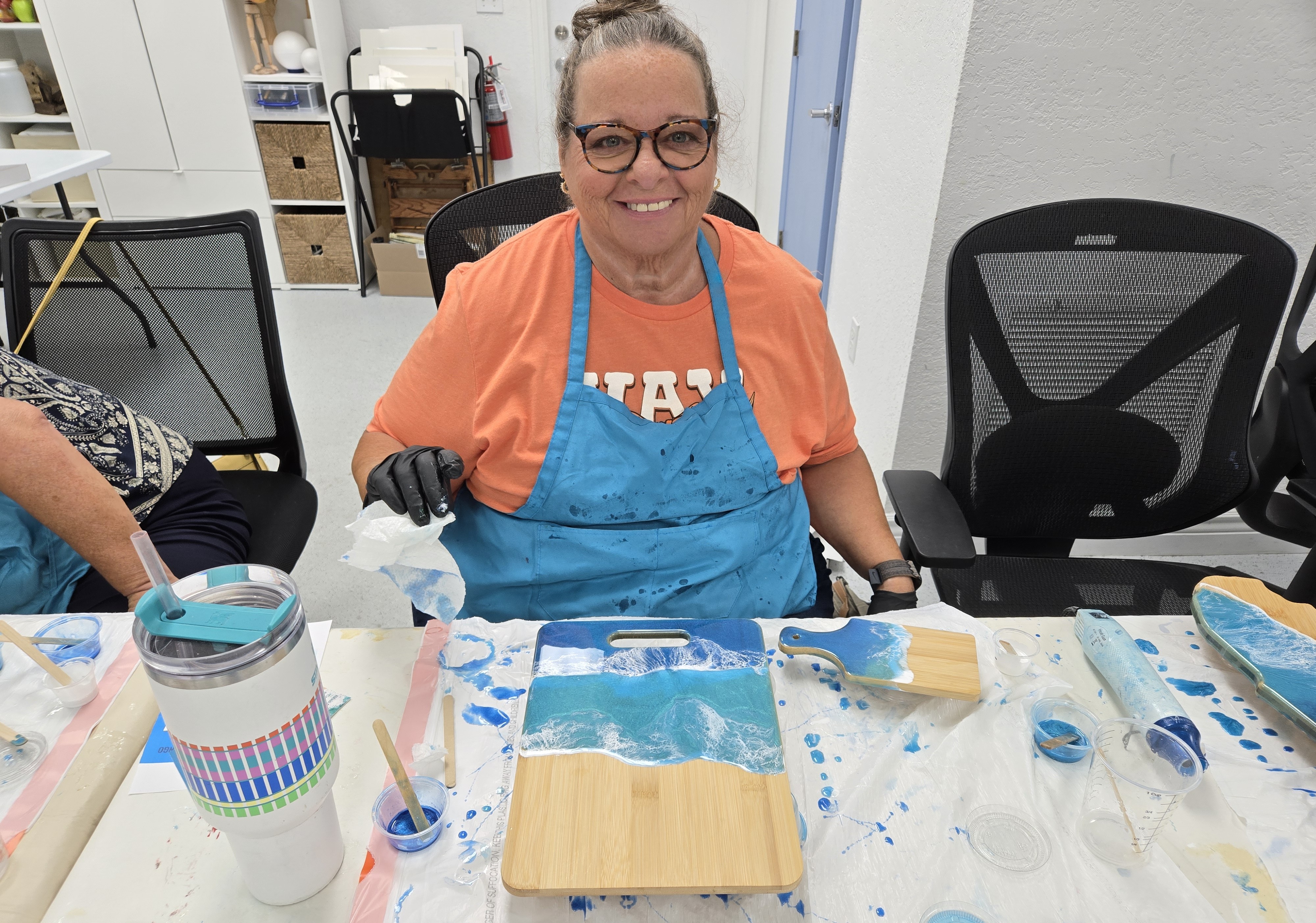 Ginger found a class in Summerville, Coastal Custom Creations, that teaches you to make Charcuterie Boards (the wooden boards, not with meat, just the boards) with a resin decorating product. Don’t look for too much technical info from me, just know I did what they said, I survived AND I didn’t throw my product int he garbage when I got home!