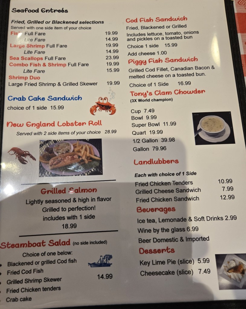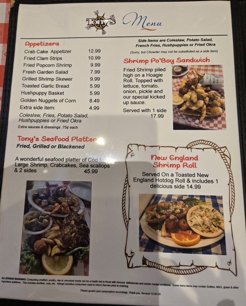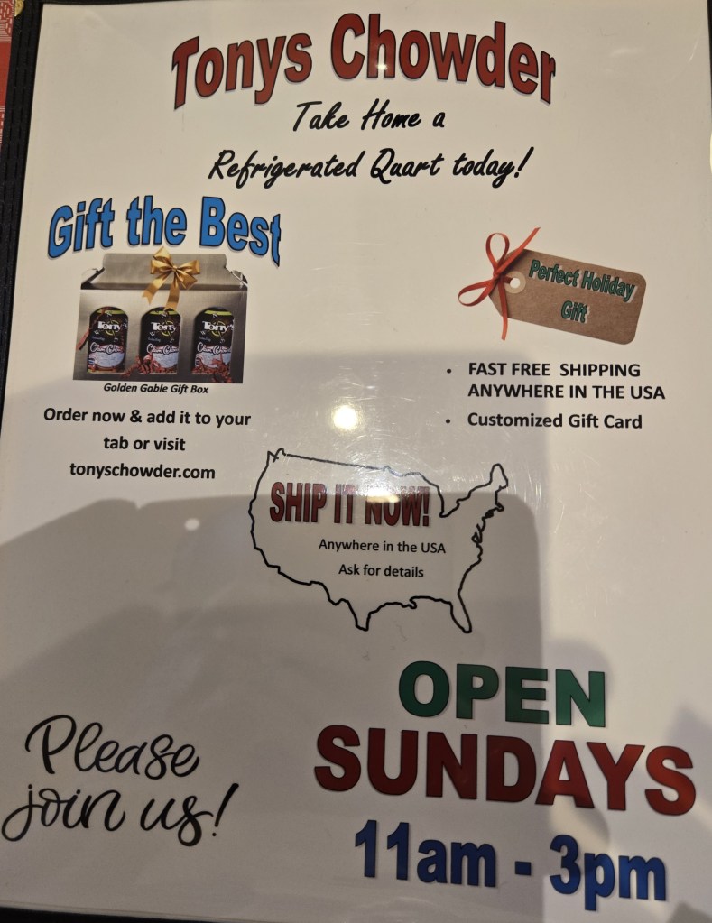 And we went to a place in Mt Dora today that was amazing. Tonys on Donnelly Street. I have posted the info and menu below. Their specialty is Clam Chowder, and I have to tell you I am not a huge fan of clam chowder. It is ok but I don’t seek it out. When we got there, we were waiting outside for others to join us and the server came out and asked if we wanted to eat inside or a table outside. Remember, it’s Florida so we can eat outside in January with 80-degree weather. She was very friendly and accommodating. When we told her we had never been there before, she brought out table small samples of their famous clam chowder to taste. And it was fantastic. I ordered a cup of soup and crab cakes. When I was done with the soup, I wasn’t hungry for the crab cakes. I must admit, I tasted them and they weren’t my favorite, but it’s not their fault. As we all know, I am not a veggie fan and when I see green, I am pretty much done. My brother-in-law at one and he thought they were terrific. So, see, I don’t know everything. But I will say if I like it, it is usually very good!
