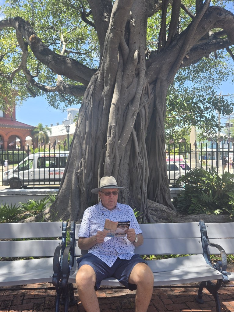 This is to show you how we started out, because it gets much worse! Walking down Whitehead Street as instructed, and there was some shade but no place to sit. After a few blocks we thought maybe the Hop On Hop Off Bus might be a better idea. We passed John’s bank so went to the teller machine for some $$$ and there goes the bus past us so we continued to walk. All the buses were now going up the street instead of down the street, so we walked some more, still no place to sit and rest. I was fascinated with the Kapok tree.
