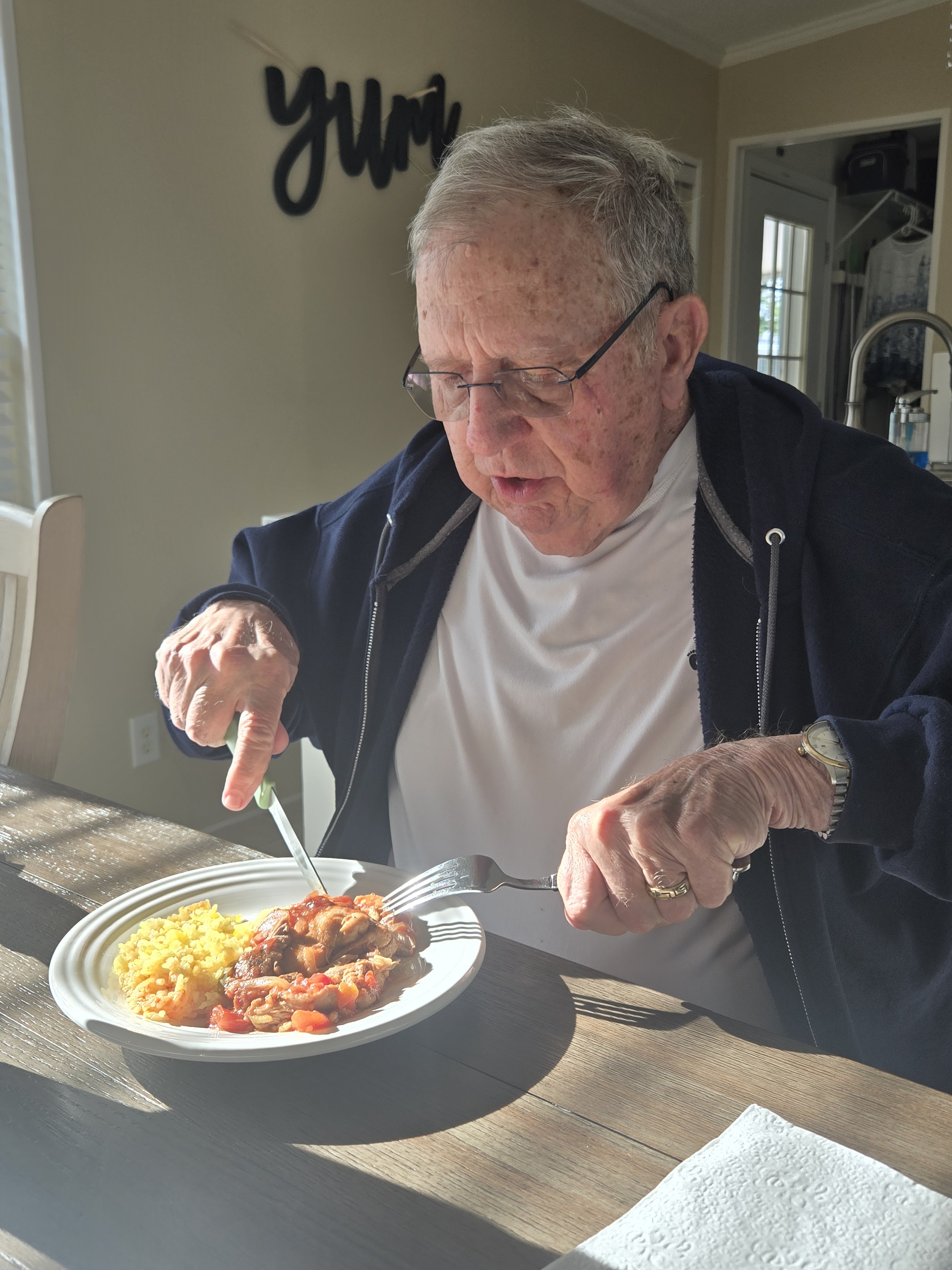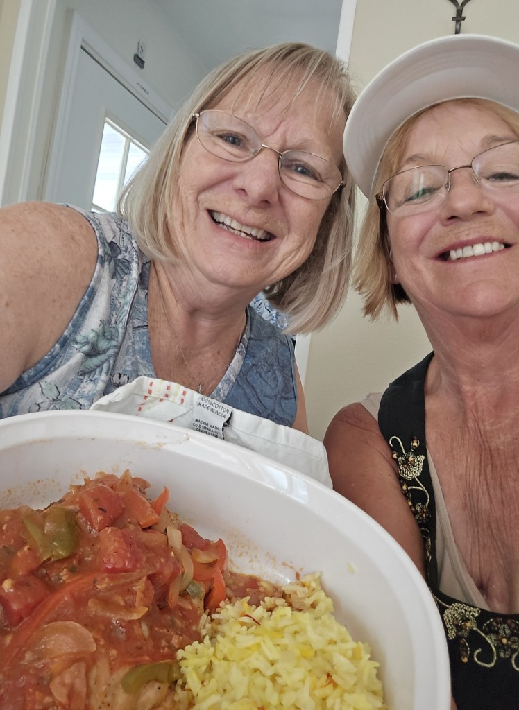 Here comes Lori with her beautiful casserole of chicken and yellow rice that she prepared, and I am so happy and excited. It smelled so good and looked amazing.