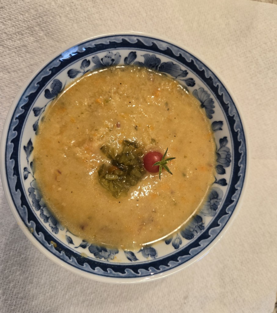 I have to call Bobbie to have her look and taste, I want to make sure it is right before I share this with others and misrepresent an entire country! So this is where I find out the vegetables are cut too large and there is too much pickle juice. Sigh. But she says it is good and, for me, it is a successful first attempt. I go home and add some chicken broth to tone down the pickle flavor, which should be a tiny hint, not a blast. And then I put the soup in my food processor and slightly pulse to make it less chunky and that changed everything. It is delicious. The pickle flavor doesn’t assault you, it’s a small “afterburn” in your throat, not offensive or hot, just there.