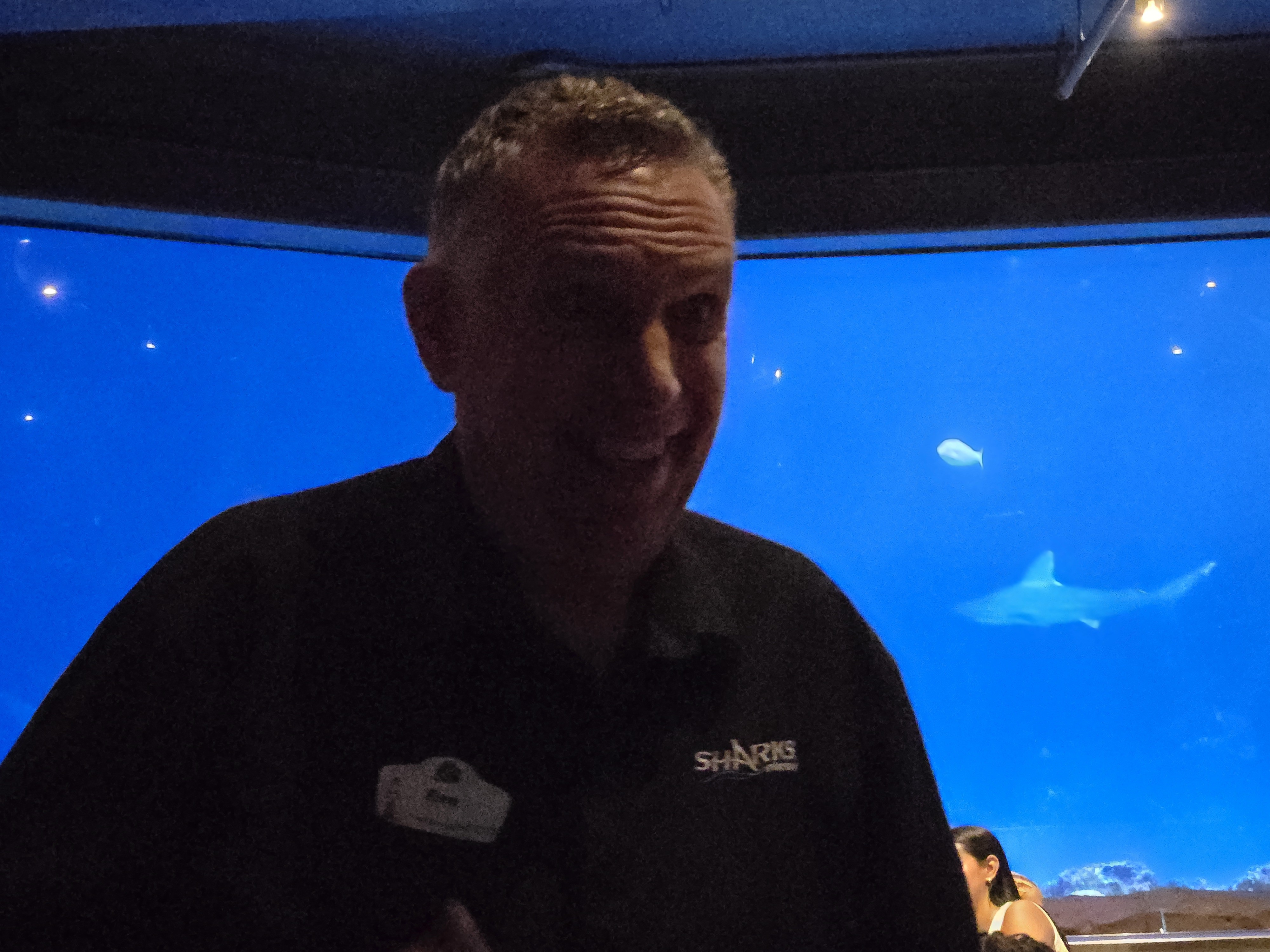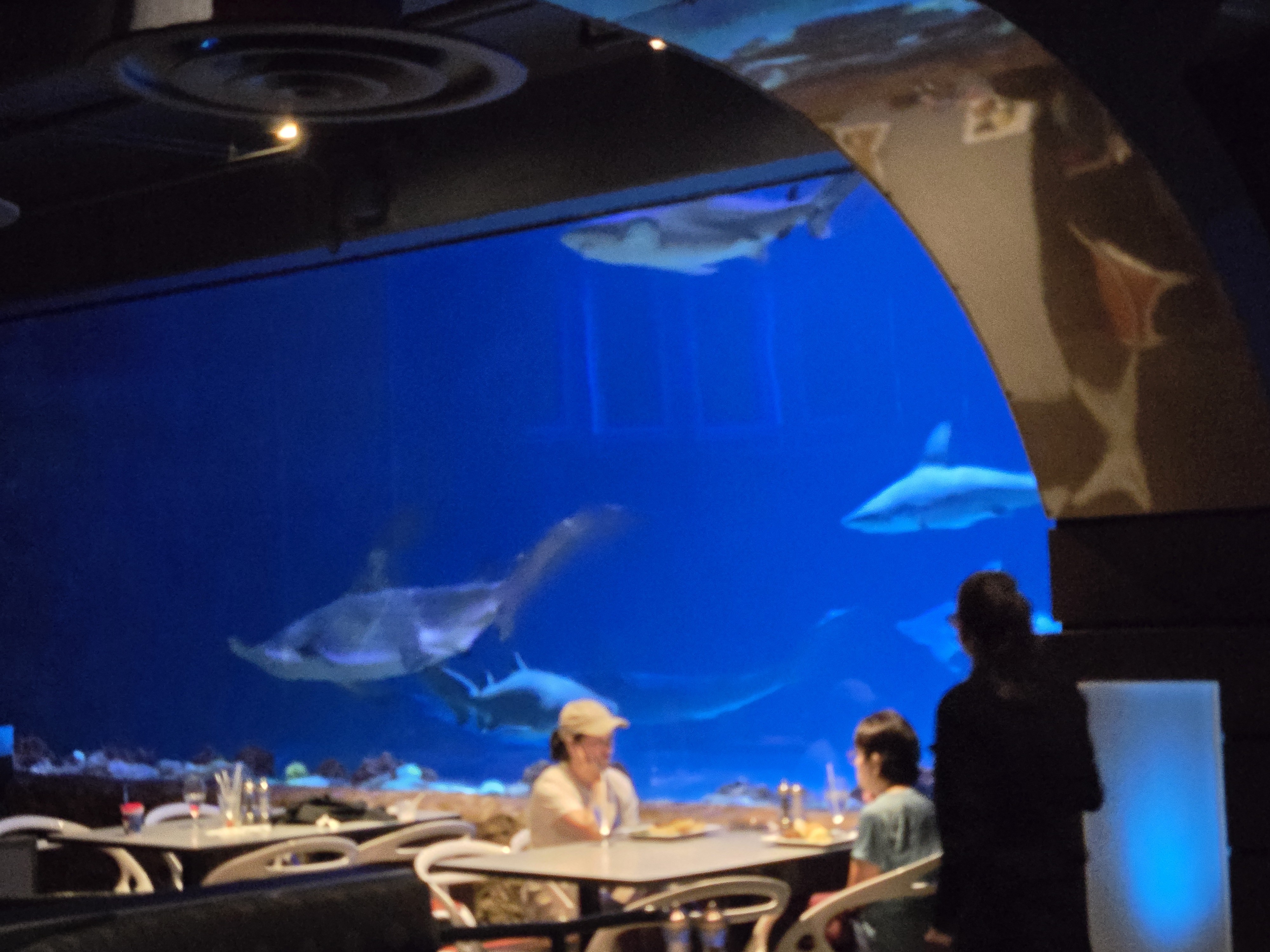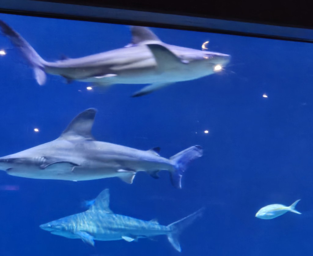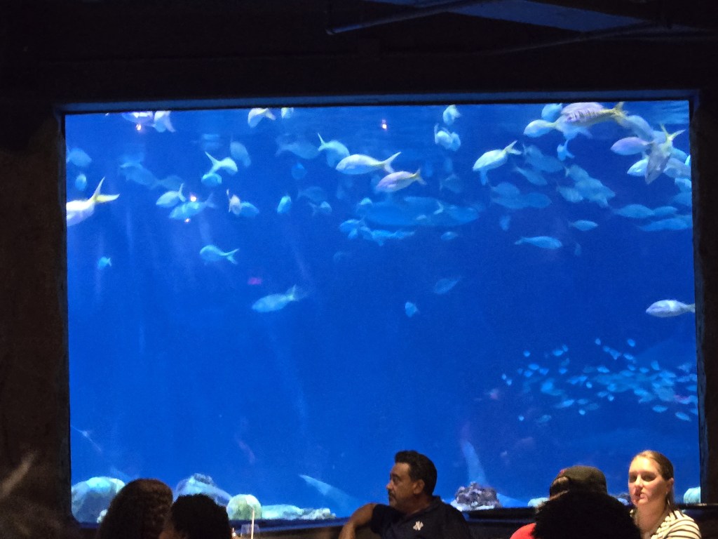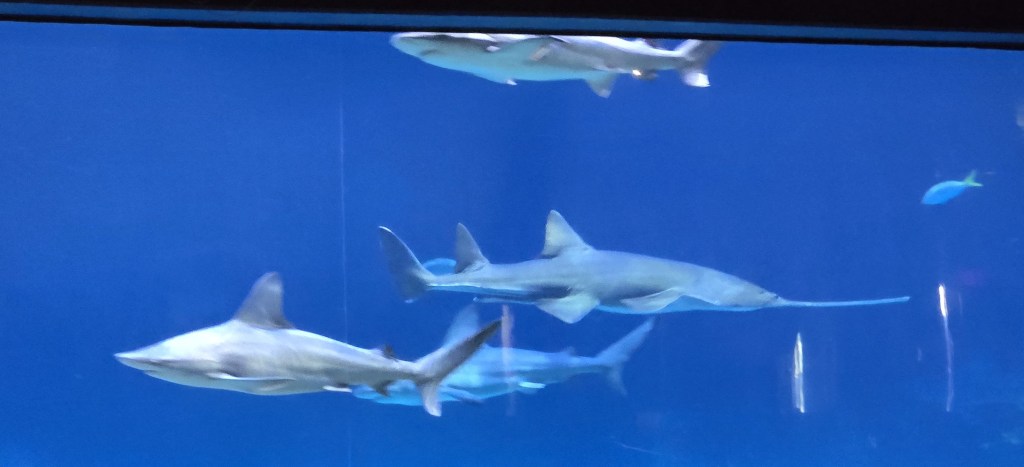 The huge aquarium was full of fish and sharks, and these were not baby sharks. They were full sized, real deal sharks.
