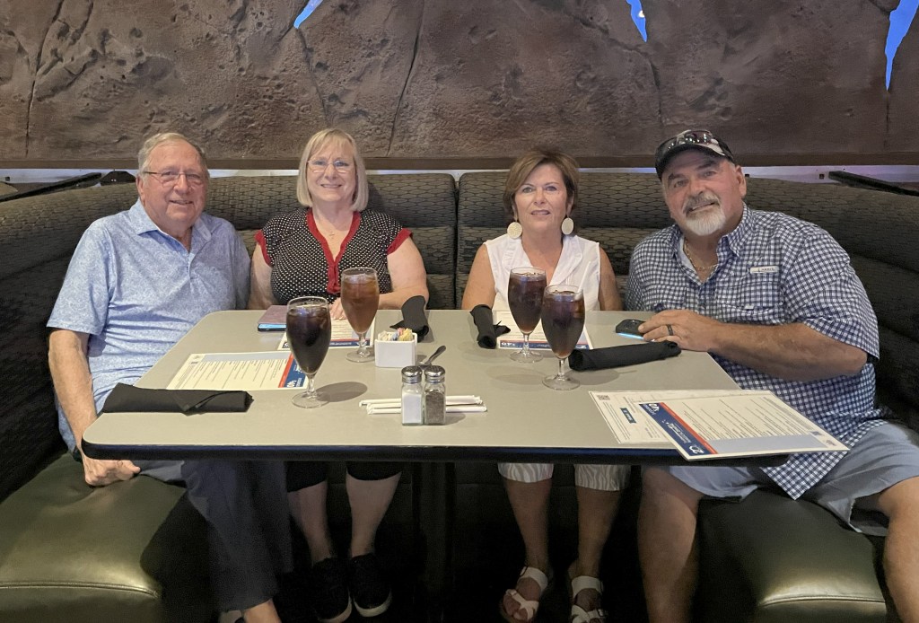 Dessert choices were Chocolate Cake Confusion, White Chocolate Raspberry Cheesecake, Cannoli Cake or Chocolate Chip Cookie Platter. Bob had chocolate cake, Cathy cheesecake and John and I had the Cannoli Cake. All were very good and large portions. We were all so full we had a bite and took the rest home for later. Way too good to waste! The meals were a success, and it was a nice time.